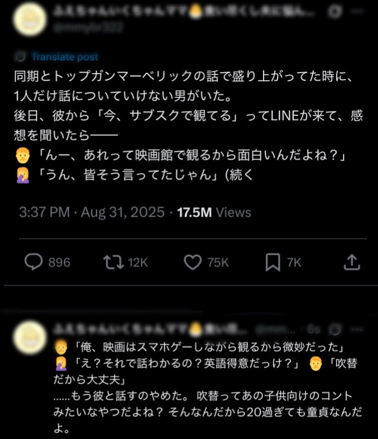 【悲報】女さん「吹替=童貞」←無事炎上wwww【画像あり】