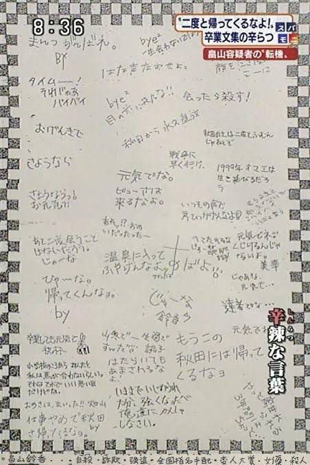 【画像】畠山鈴香さんの卒アルの寄せ書き、悲惨すぎるWWWWWWWWWWWWWW