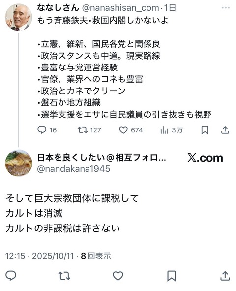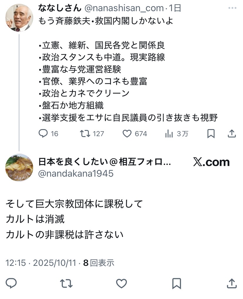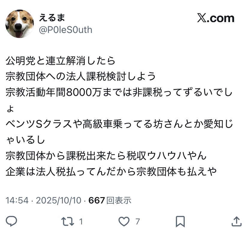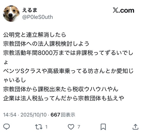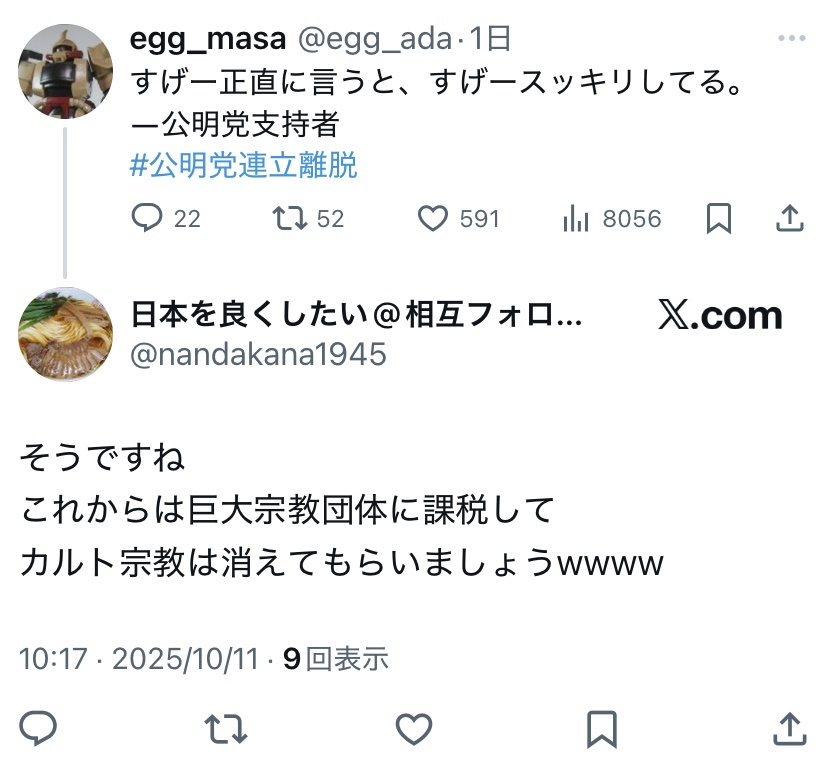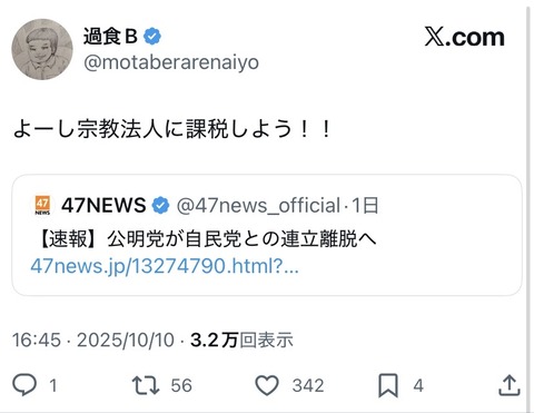 【悲報】高市支持者、公明党にブチギレ「宗教法人に課税しろ💢」