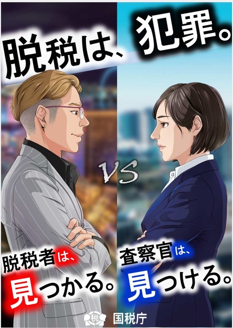 【悲報】国税庁のポスター「──脱税者は、見つかる。──査察官は、見つける。」