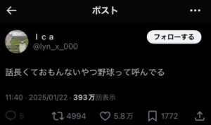 【画像】X民「話長くておもんないやつ野球って呼んでる」←5.4万いいねwwwwwwwwww