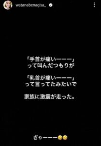 渡邊渚「乳首が痛いと叫んでしまって家族に激震が走った」SNSに謎の投稿