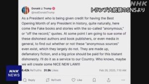 トランプ大統領「今後、匿名を情報元にしたメディアは全員訴えます。情報源実在するか明らかにするためだ」 1: 名無し 2025/02/27(木) 08:49:49.11 ID:sb4mWcD49 トランプ大統領 匿名用いて […]