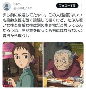 【悲報】一般女性様、宮崎駿に物申す「宮崎駿は若い女性と高齢女性が違う生き物だと思っているのか?」→4.7万いいねwwwwwww