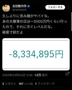 吉田製作所さん、また株で800万失う😭