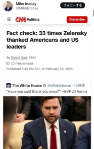 バンス「ゼレンスキーはアメリカに一回でも感謝したのか!😡」→33回感謝してたことが判明