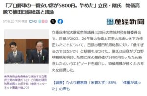【悲報】立憲・階議員「息子と野球観戦しようと神宮の窓口まで行ったが1番安い席が5800円なのでやめた。私の感覚だと2000円」息子「」 1: 名無し 2025/05/31(土) 07:17:38.58 ID:hkN4d9 […]
