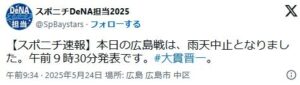 本日の広島対DeNA戦、雨天中止 転載元: https://tanuki.5ch.net/test/read.cgi/livebase/1748003813/ 529: どうですか解説の名無しさん 2025/05/24( […]