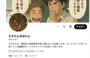 【魚類転生】「えそたんまほたん(@esotan7)」がついに鍵垢を解除 Xの大海に泳ぎ出す…! ( ´∀`)つ 関連記事 【魚類転生】還暦フェミナチ・うぉボーイズが「えそたんまほたん(@esotan7)」とし […]