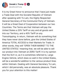トランプ大統領、ベトナムと貿易協定を締結 べトナムに20%の関税、他国がベトナム経由で輸出するなら40%の関税