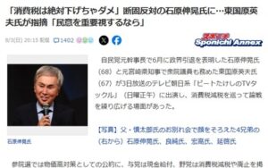 【速報】石原伸晃「消費税は絶対下げちゃダメ」モデル「一時的に…」石原「それはできない」東国原「民意を」石原「民意がそうであっても守るべきものは守るのが政治家」