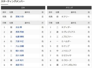 侍ジャパン、25年初陣オランダ戦のスタメンが発表!1番に水谷瞬。3番・佐藤輝明、4番は万波中正、大山悠輔は5番。宮城大弥が地元で先発登板
