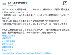 株式会社エイブルの総合研究所、Xでクルド人問題に言及で日本人のせいにするような投稿→炎上、削除謝罪するも消せば増えるで消火失敗